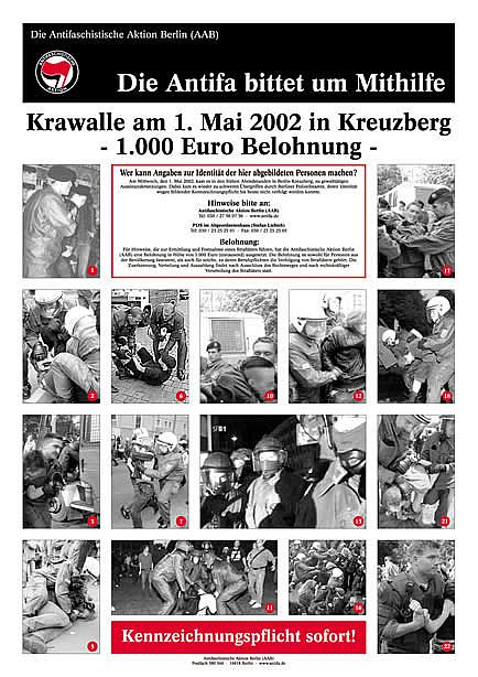 21 Oct 2002 The Berlin Police does not want you to see this graphic, a parody of a 'wanted' poster depicting alledged acts of police brutality on May Day. As reported by Der Schockwellenreiter and Heise, the police threatened to shut down the website of the creators of the parody, the Anitfascist Action Berlin, unless the posters was pulled from their website. The police have now started issuing similar threats to sites mirroring the poster, and Der Schockwellenreiter has called on bloggers everywhere to mirror the poster to render the censorship efforts absurd. Now, I find the poster in questionable taste, as well as the whole 'tradition' of May Day rioting, but I should be able to view the poster myself and make my own decision.